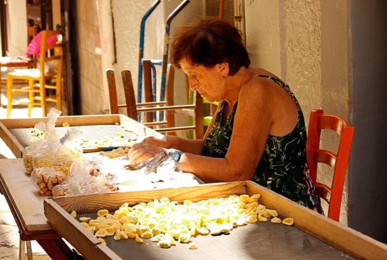 In Apulien ist Essen kein Event – es ist Alltag.Und genau darin liegt die Magie. Ältere Frauen rollen Orecchiette von Hand, Familien kochen gemeinsam, der Wein steht selbstverständlich auf dem Tisch.